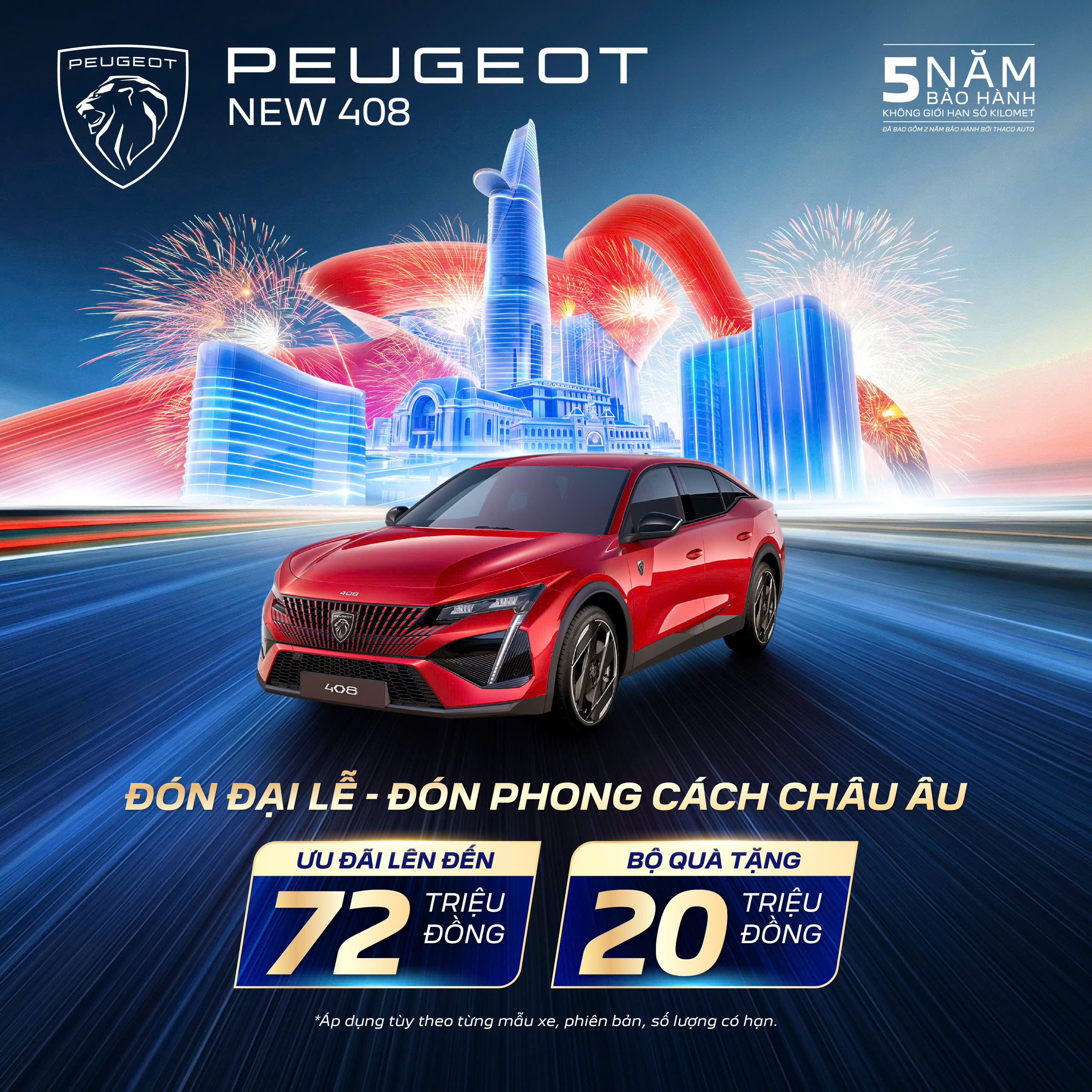 New Peugeot 408 mang thiết kế SUV Coupé khác biệt, kết hợp động cơ 1.6L Turbo PureTech và hộp số tự động 8 cấp, đem lại khả năng vận hành mạnh mẽ và tăng tốc 0–100 km/h trong 8,8 giây. Khoang nội thất được phát triển theo ngôn ngữ Peugeot i-Cockpit®, tối ưu trải nghiệm Nghe – Nhìn – Chạm, tạo nên không gian hiện đại và giàu cảm xúc cho người lái. Đừng bỏ lỡ cơ hội sở hữu New Peugeot 408 với mức ưu đãi lên đến 72 triệu đồng trước Đại lễ.