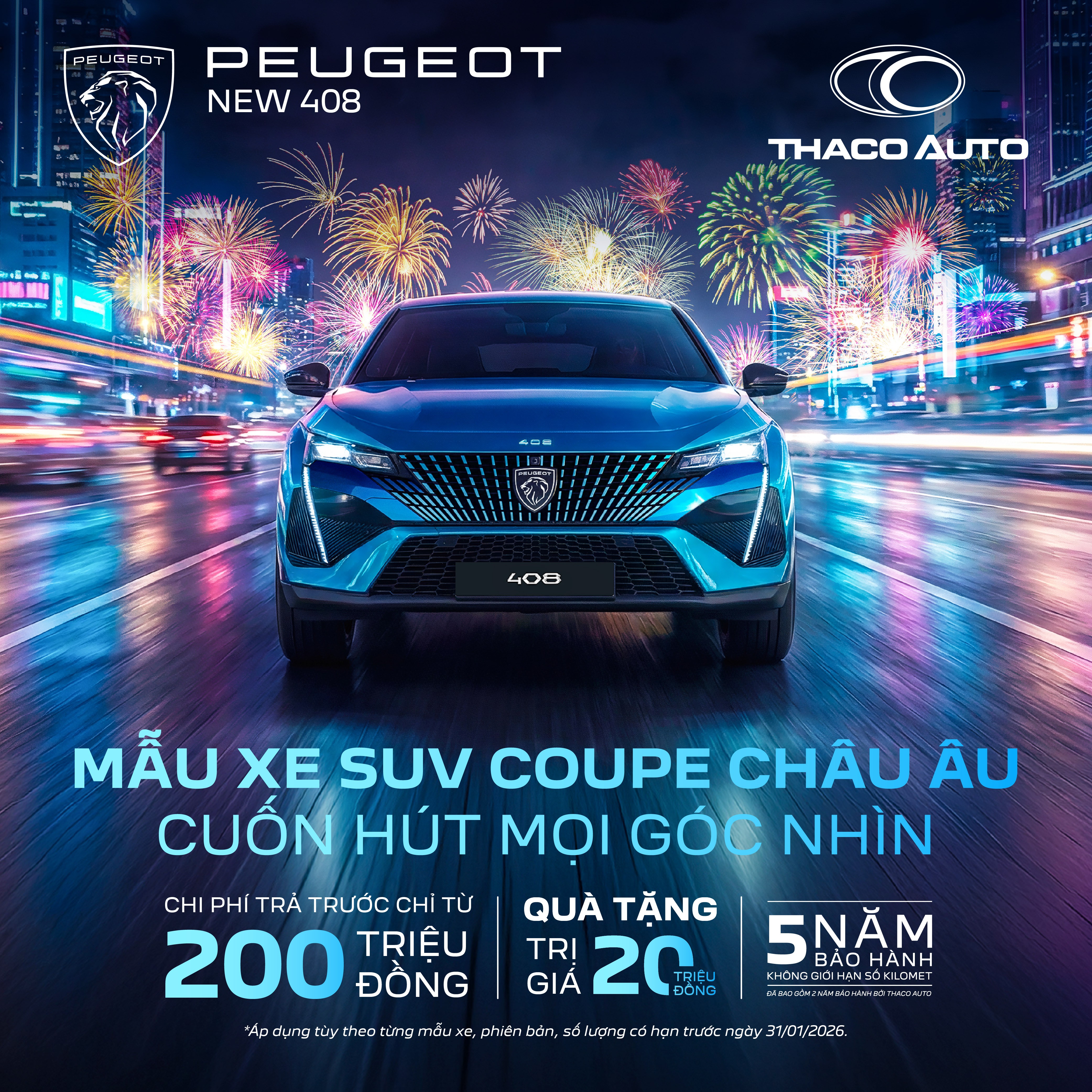 New Peugeot 408 là lựa chọn dành cho những khách hàng yêu thích sự khác biệt. Không gian bên trong New Peugeot 408 được thiết kế theo ngôn ngữ Peugeot New i-Cockpit, tối ưu hóa trải nghiệm Nghe – Nhìn – Chạm, mang đến cảm giác độc đáo và khác biệt. Với động cơ 1.6 Turbo Puretech thế hệ mới mạnh mẽ vượt trội kết hợp cùng hộp số tự động 8 cấp cho khả năng tăng tốc từ 0 đến 100 km/h trong vòng 8.8 giây giúp New Peugeot 408 trở thành bạn đồng hành lý tưởng cho các chuyến du lịch hoặc những cuộc dạo phố ngày lễ. Trong năm 2026, New Peugeot 408 mang đến lợi thế lớn với giá bán chỉ từ 999 triệu đồng và chi phí trả trước chỉ từ 200 triệu đồng. Đặc biệt, phiên bản Legend Edition – giới hạn chỉ 215 chiếc – gây ấn tượng với màu sơn Xám Selenium mới, ghế da nâu sang trọng, logo kỷ niệm 215 năm trên tựa đầu ghế và bộ quà sưu tầm độc quyền. Đây là cơ hội lớn nhất trong năm để sở hữu ngay phiên bản kỷ niệm 215 năm, chỉ có duy nhất dịp cuối năm.
