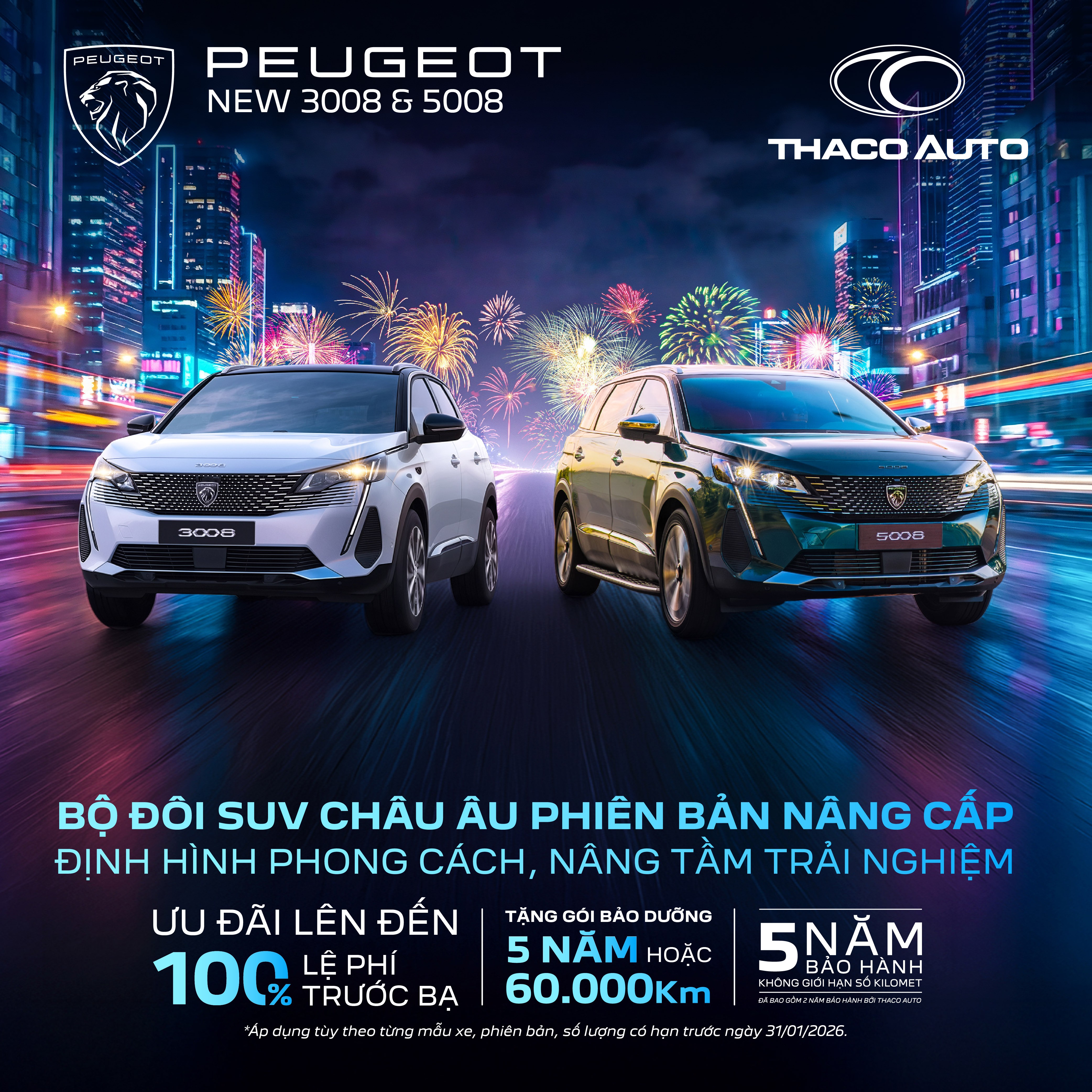 Khởi đầu năm mới cùng New Peugeot 3008 & 5008 phiên bản nâng cấp, bộ đôi SUV châu Âu dẫn đầu phân khúc C và D, giá chỉ từ 849 triệu đồng kèm 100% lệ phí trước bạ, quà tặng 20 triệu đồng và bảo dưỡng 5 năm hoặc 60.000 km trị giá 42 triệu đồng.