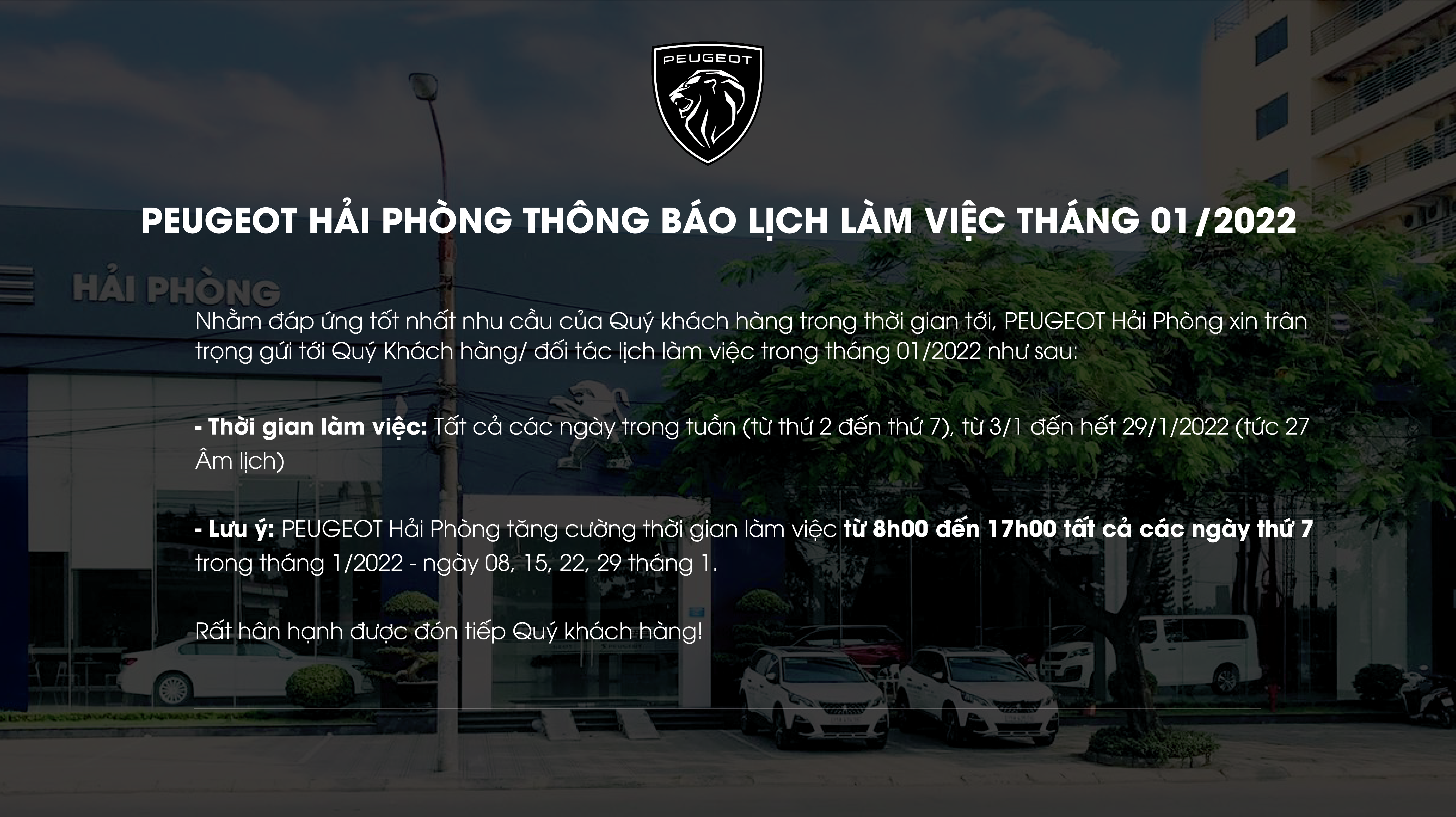 PEUGEOT HẢI PHÒNG THÔNG BÁO LỊCH LÀM VIỆC THÁNG 1/2022