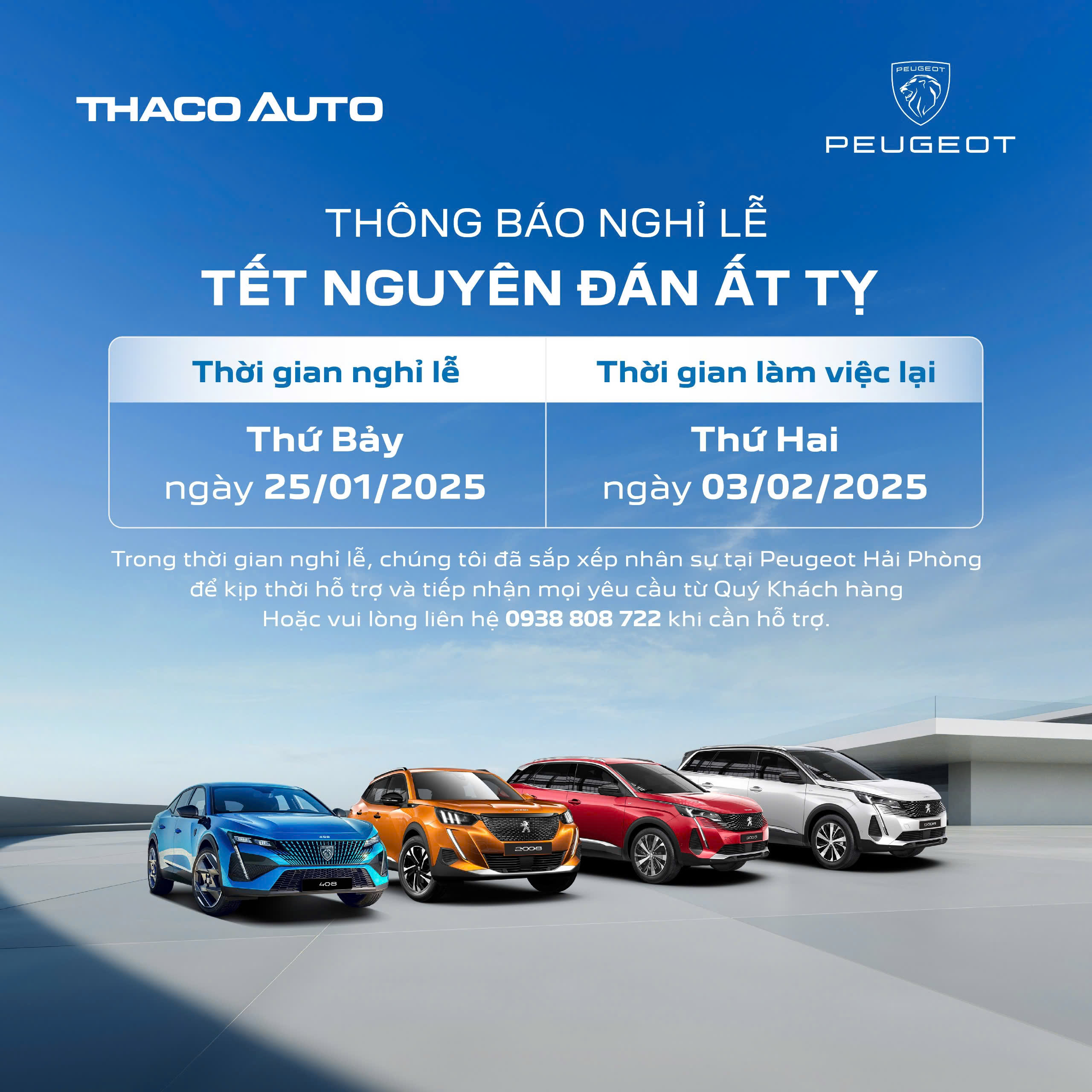 Trong thời gian nghỉ Tết Nguyên Đán Từ ngày 25/1/2025 (26/12 Âm lịch) đến hết ngày 03/2/2025, chúng tôi luôn bố trí nhân sự trực tại Peugeot Hải Phòng và sẵn sàng tiếp nhận nhu cầu từ Quý khách hàng. Hoặc vui lòng liên hệ Hotline: 0938 808 722 để được hỗ trợ kịp thời.